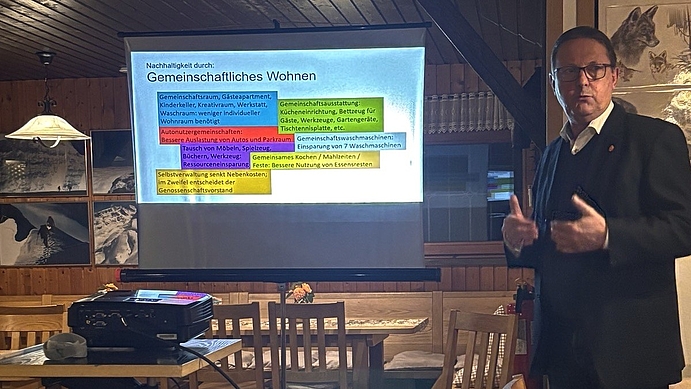 „Nachhaltig wohnen, gemeinschaftlich leben“, unter diesem Titel lud der ÖDP Ortsverband Mainburg zu seiner Abschlussveranstaltung zur Kommunalwahl 2026 am vergangenen Montag in die Theresienhütte. Bürgermeisterkandidatin Annette Setzensack begrüßte als Referenten Dr. Michael Stöhr, Landesbeauftragter für Klimaschutz der ÖDP-Bayern. Stöhr ist Experte für erneuerbare Energien und wohnt seit 25 Jahren in einem Mehrgenerationen-Genossenschaftshaus der WOGENO e.G. in München. Seine drei Kinder sind dort aufgewachsen, in lebendiger Gemeinschaft mit vielen anderen Kindern. Gemeinschaftliches Wohnen ermöglicht Geselligkeit, gegenseitige Unterstützung, gemeinsam genutzte Gegenstände ersparen eigene Anschaffungen. Soziales und Ökologie gehen Hand in Hand.