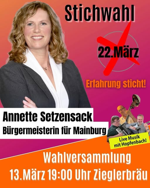 Die Bürgermeisterkandidatin Annette Setzensack lädt alle Bürger zu einer Infoveranstaltung ein und beantwortet ihre Fragen zur Zukunft Mainburgs. Dazu gibt es von "Hopfenbach!" live etwas auf die Ohren!